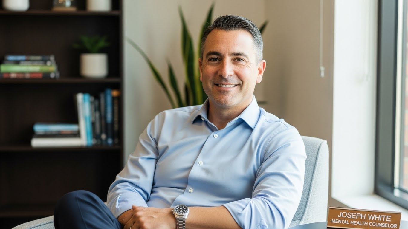 Joseph White is a caring mental health counselor. He helps people face life’s tough times. He uses a whole-person approach to therapy, helping with anxiety, depression, and trauma.